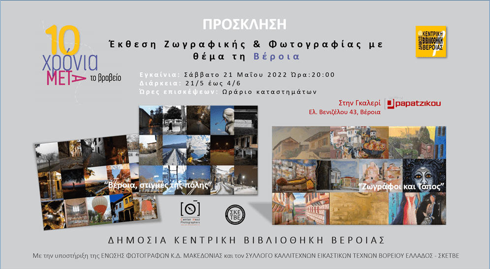 Η Δημόσια Κεντρική Βιβλιοθήκη Βέροιας σας προσκαλεί στα εγκαίνια της έκθεσης Φωτογραφίας και Ζωγραφικής που θα πραγματοποιηθεί το Σάββατο 21.05.2022, στις 20:00, στη Γκαλερί ΠΑΠΑΤΖΙΚΟΥ (Ελ. Βενιζέλου 43, Βέροια).