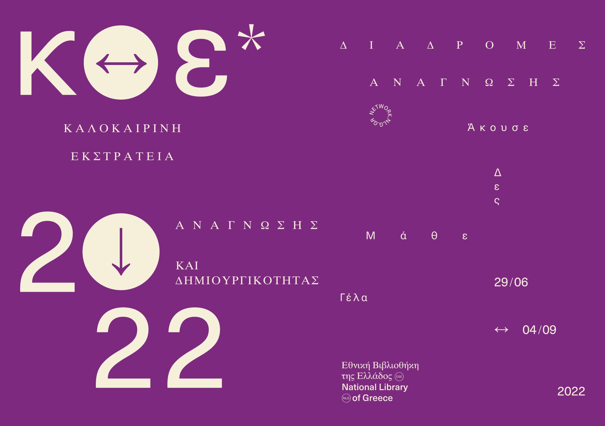 Η Καλοκαιρινή Εκστρατεία Ανάγνωσης και Δημιουργικότητας 2022 διοργανώνεται από την Εθνική Βιβλιοθήκη της Ελλάδος και υλοποιείται χάρη στην αγαστή συνεργασία της ΕΒΕ και του Εργαστηρίου Παιδαγωγικών Εφαρμογών και Παραγωγής Εκπαιδευτικού Υλικού, του Παιδαγωγικού Τμήματος Δημοτικής Εκπαίδευσης του ΕΚΠΑ.