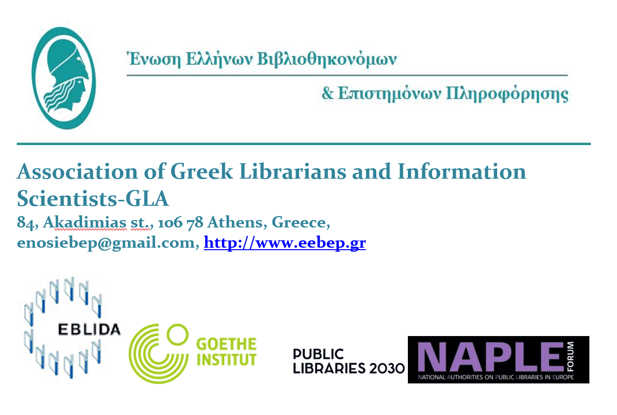 Συνδιοργανωτές του φετινού συνεδρίου της EBLIDA είναι η Ένωση Ελλήνων Βιβλιοθηκονόμων και Επιστημόνων Πληροφόρησης και το Goethe Institut της Αθήνας. Συνεργάτες της διοργάνωσης του Συνεδρίου είναι οι φορείς “Public Libraries 2030″ και “NAPLE Forum – National Authorities on Public Libraries in Europe”.